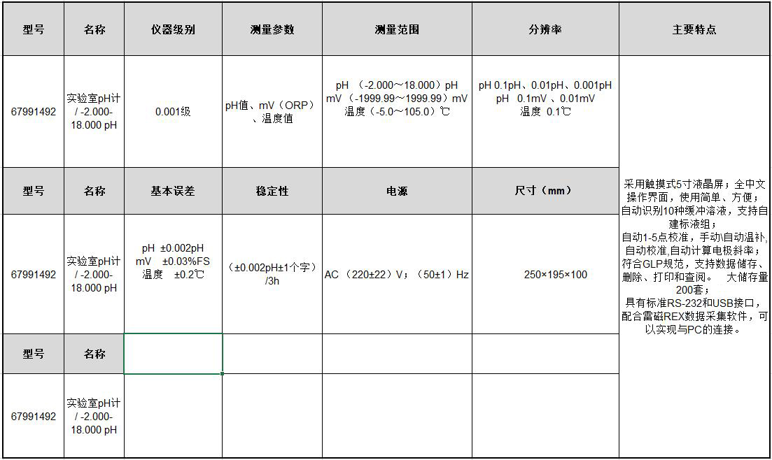 B17531 67991492 pH(-2.000~18.000)pH mV(-1999.99~1999.99)mV 温度(-5.0~105.0)℃ pH0.1pH、0.01pH、0.001pH pH0.1mV、0.01mV 温度0.1℃ 0.001级 pH值、mV(ORP)、温度值 pH±0.002pH mV±0.03%FS 温度±0.2℃ (±0.002pH±1个字)/3h AC(220±22)V;(50±1)Hz 250×195×100mm 2Kg 31730.40