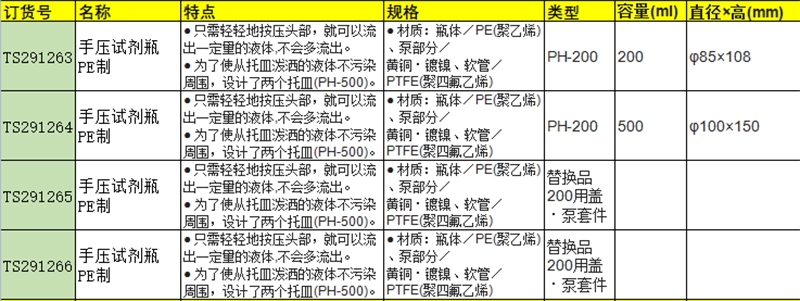瓶体/PE(聚乙烯)、泵部分/黄铜・镀镍、软管/PTFE(聚四氟乙烯)