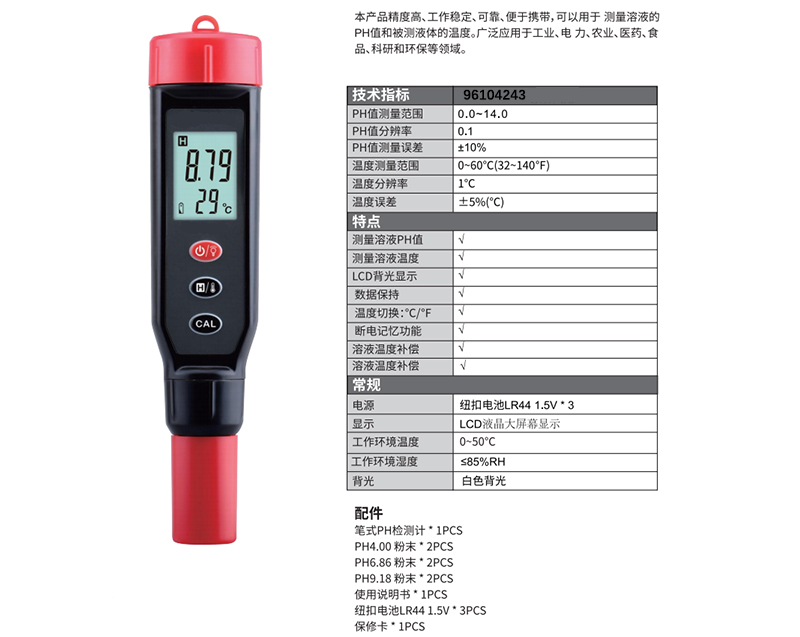 ·本产品精度高、工作稳定、可靠、便于携带,可以用于测量溶液的PH值和被测液体的温度。