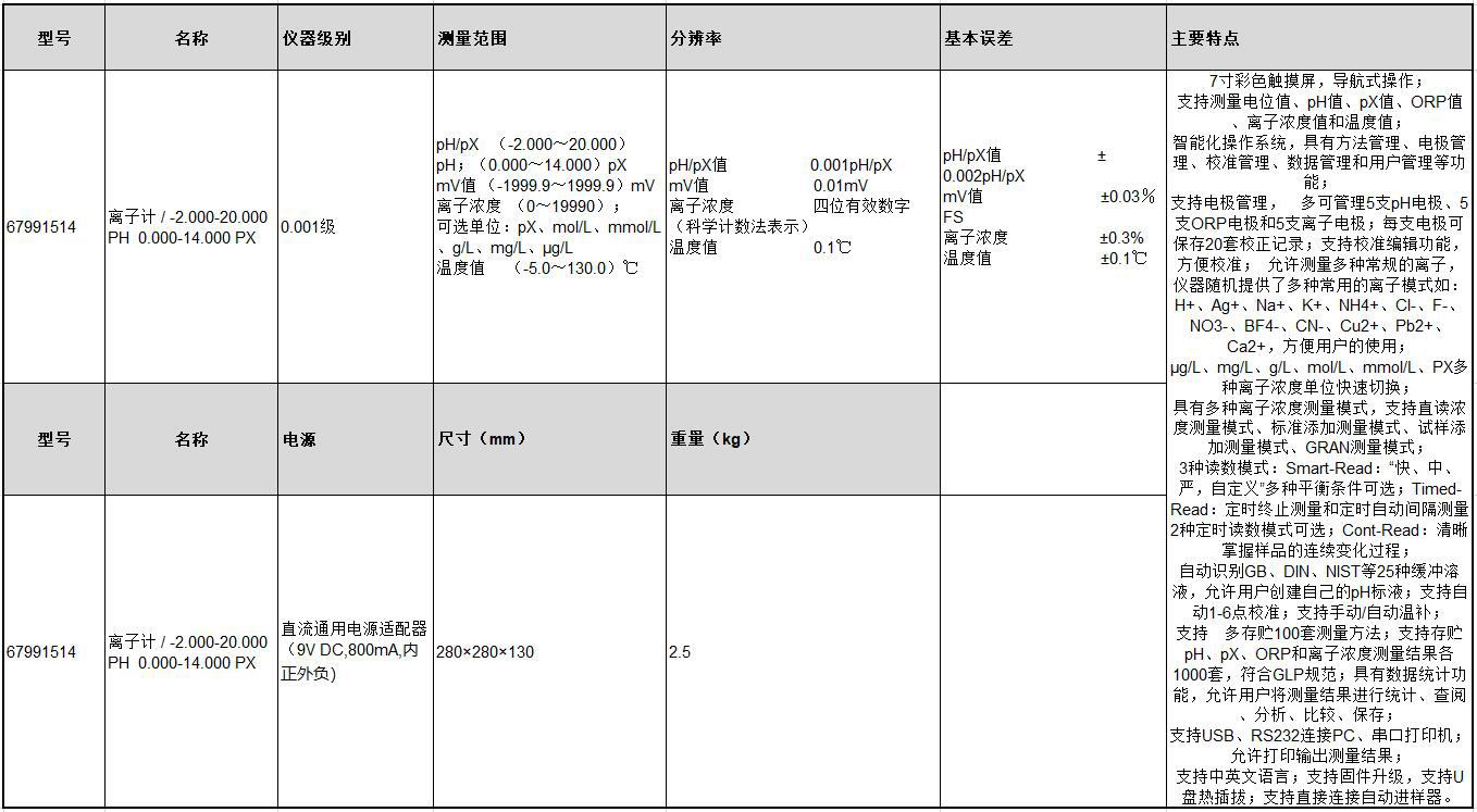 B17548 67991514 pH/pX(-2.000~20.000)pH;(0.000~14.000)pX mV值(-1999.9~1999.9)mV 离子浓度(0~19990);可选单位:pX、mol/L、mmol/L、g/L、mg/L、μg/L 温度值(-5.0~130.0)℃ pH/pX值0.001pH/pX mV值0.01mV 离子浓度四位有效数字(科学计数法表示) 温度值0.1℃ 0.001级 pH/pX值±0.002pH/pX mV值±0.03%FS 离子浓度±0.3% 温度值±0.1℃ 直流通用电源适配器(9VDC,800mA,内正外负) 280×280×130mm 2.5KG 44195.54