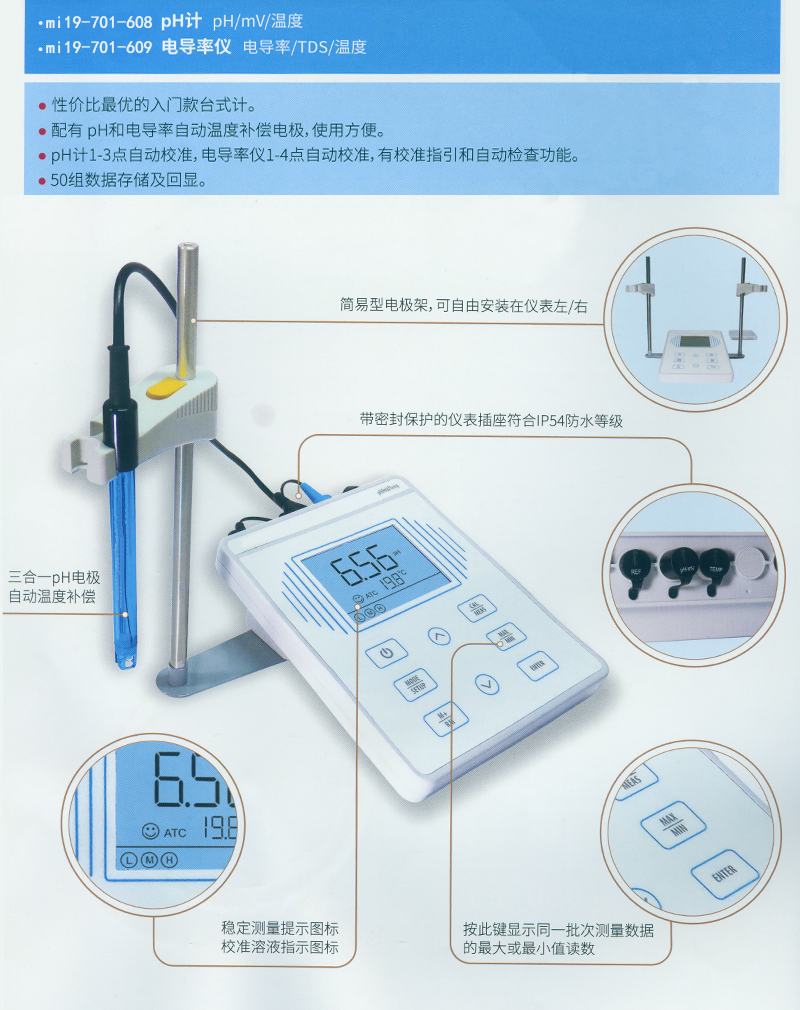 ·大屏幕液晶显示 ·具有手动温度补偿、一点或二点校准 ·经济实惠,性价比高