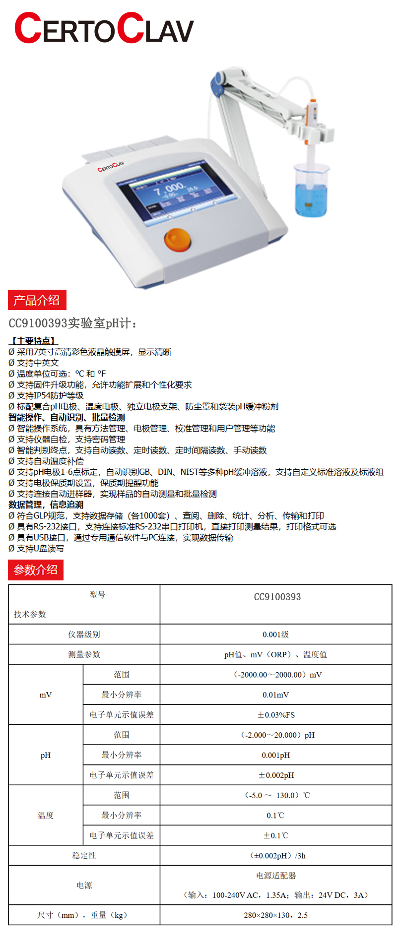 ·采用7英寸高清彩色液晶触摸屏,显示清晰; ·支持中英文; ·温度单位可选:℃和℉ ·支持固件升级功能,允许功能扩展和个性化要求; ·支持IP54防护等级; ·标配复合 pH 电极、温度电极、独立电极支架、防坐罩和袋装 pH 缓冲粉剂。