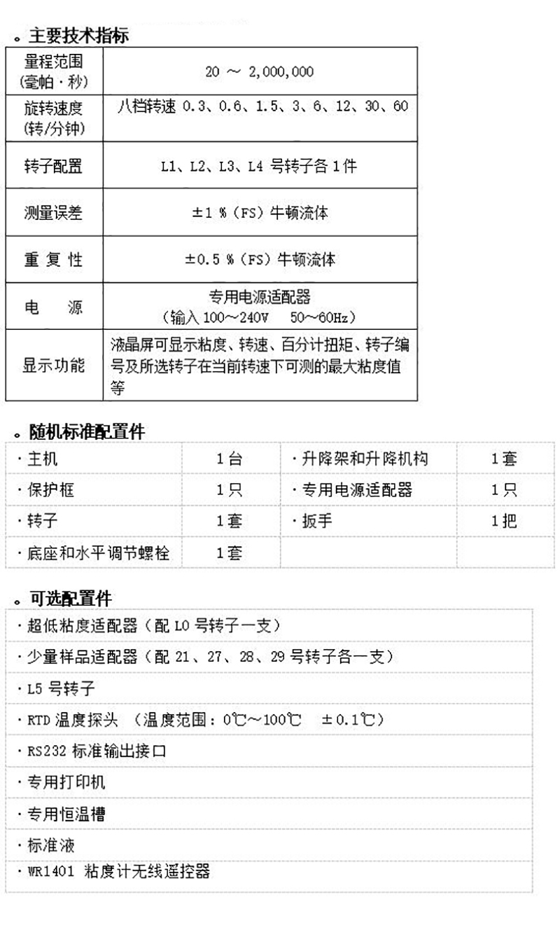 ·采用16位微处理器控制电路,直接显示粘度、转速、扭矩、转子号及可测最大粘度值等,可选配打印机和RTD温度探头。
