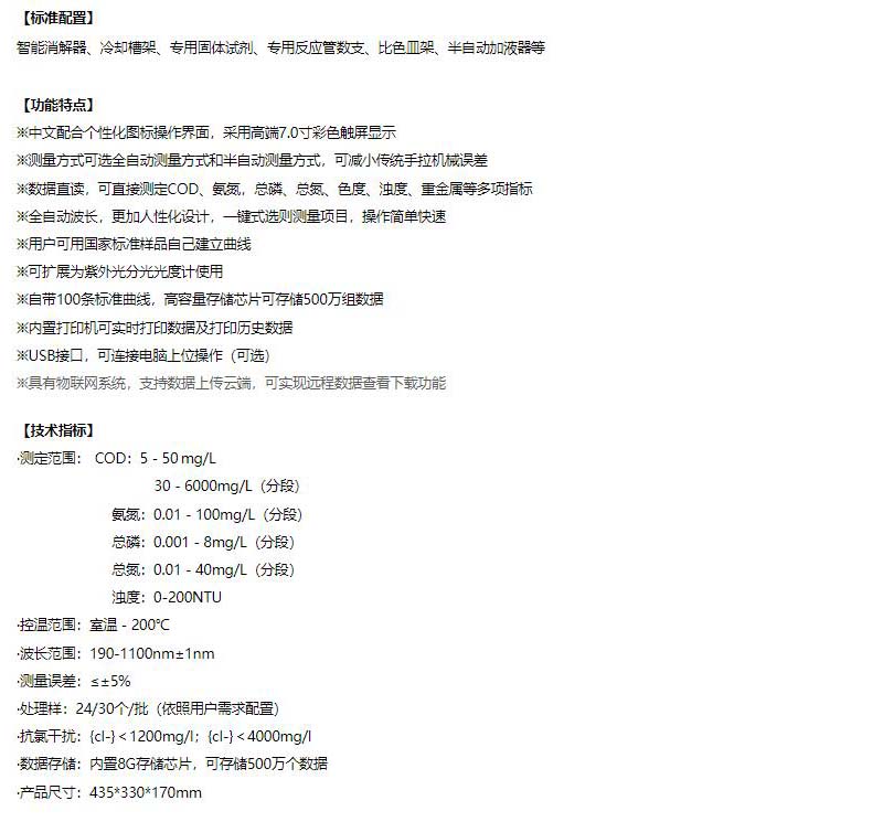 ·数据直读,可直接测定COD、氨氮,总磷、总氮、色度、浊度、重金属等多项指标