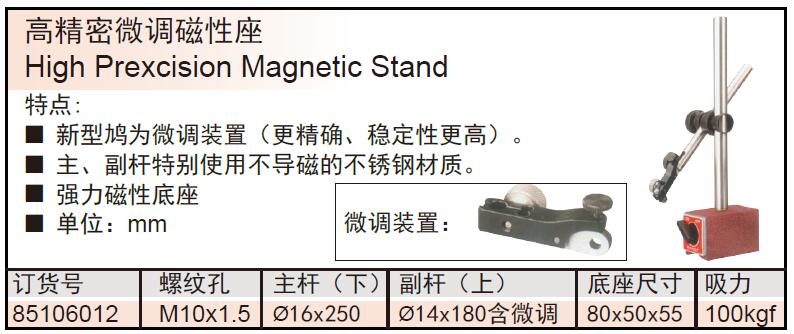 ·新型鸠为微调装置(更、稳定性更高)。 ·主、副杆特别使用不导磁的不锈钢材质。 ·强力磁性底座 ·单位:mm