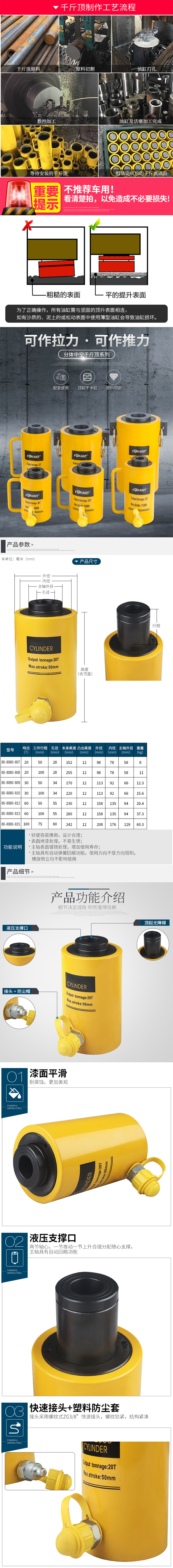 ·中空柱塞设计,单作用,弹簧回缩 ·烤漆表面增强耐腐蚀能力 ·高强度合金钢,经顶级热处理 ·个型号均配一一个3/8公接头和防尘帽 ·柱塞头部经过热处理,无需使用鞍座