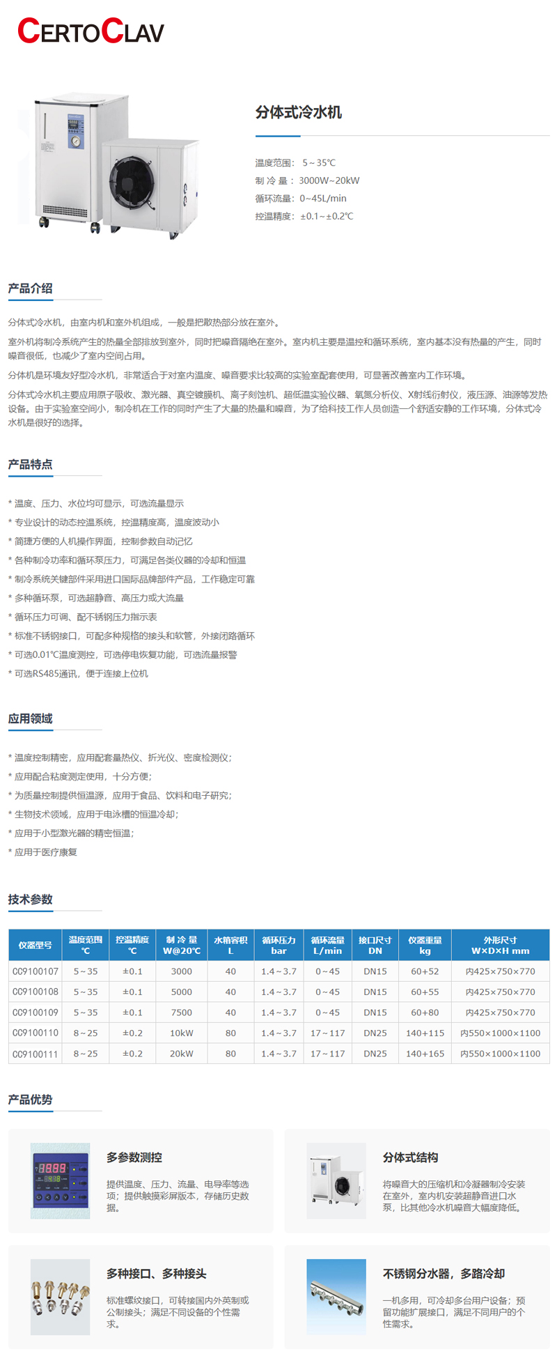 ·由室内机和室外机组成,一般是把散热部分放在室外; ·室外机将制冷系统产生的热量全部排放到室外,同时把噪音隔绝在室外; ·室内机主要是温控和循环系统,室内基本没有热量产生,同时噪音很低,也减少了室内空间占用; ·分体机是环境友好型冷水机,非常适合于对室内温度、噪音要求比较高的实验室配套使用,可显著改善室内工作环境。
