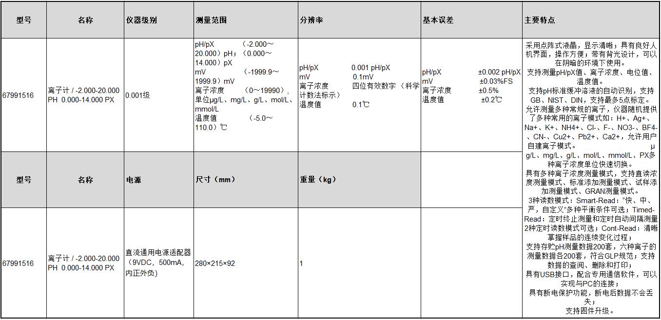 B17548 67991514 pH/pX(-2.000~20.000)pH;(0.000~14.000)pX mV值(-1999.9~1999.9)mV 离子浓度(0~19990);可选单位:pX、mol/L、mmol/L、g/L、mg/L、μg/L 温度值(-5.0~130.0)℃ pH/pX值0.001pH/pX mV值0.01mV 离子浓度四位有效数字(科学计数法表示) 温度值0.1℃ 0.001级 pH/pX值±0.002pH/pX mV值±0.03%FS 离子浓度±0.3% 温度值±0.1℃ 直流通用电源适配器(9VDC,800mA,内正外负) 280×280×130mm 2.5KG 44195.54